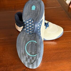 Navy and white design. Like new - barely used. K-Swiss Express Light Shoe that is specifically designed for pickleball hard courts. Comfortable, lightweight and breathable, the Express Light provides great support so you can make hard steps, slides and cuts for the ball and have a chance to return everything your opponents throw at you. The all-around performance is fast and perfect for a wide range of athletes that are stepping onto the pickleball court.