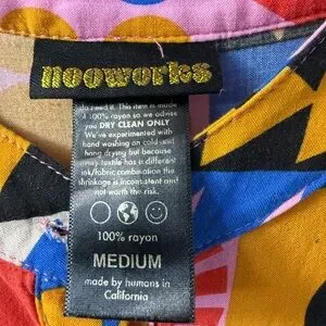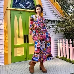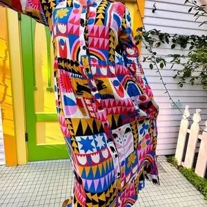 Made in light weight rayon, this long sleeve, long dress features the fabulous art of Lisa Congdon. It buttons all the way up and features red, blue, pink, and yellow hues. Wore only a few times. Great condition!