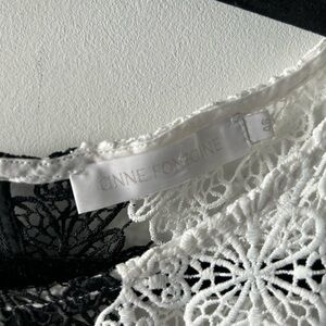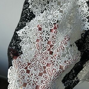 Black and white sheer lace dress - NO LINING - back zipper closure - cold shoulder style short sleeves - chest across measures 21" - total length measures 39" - size 46 = measures like size XL