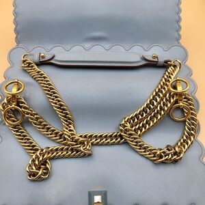 Featuring a chic blue color and unique scalloped edges, this bag is perfect for any occasion. The gold chain adds a touch of luxury.