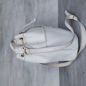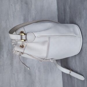 Vintage, Gucci, white small GG logo coated canvas and leather, shoulder or cross body, drawstring bucket style bag with an exterior pocket in front! This popular Gucci style is a perfect everyday bag and the only white purse you will ever need!