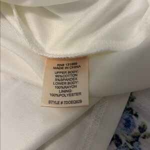 Chic strapless dress with a floral pattern. Features a white top and a blue and green floral skirt. This is new never worn cotton stretch full tiered skirt lined the lining has small snag no hole