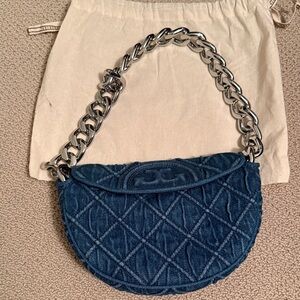 Tory Burch Mini Fleming Soft Denim Crescent Bag in Quilted Blue Denim