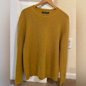 Mustard yellow mens crewneck sweater, 100% merino extra fine Italian wool. Shoulders 18 inches across and length 25 inches. Size L but would fit size M best.