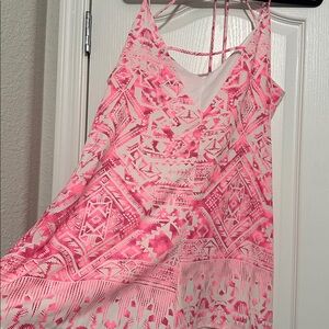 Chic dress with pink patterns. Features spaghetti straps. Ideal for casual wear.