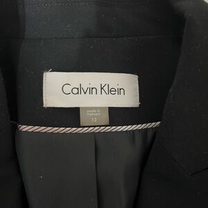 Sophisticated black suit jacket by Calvin Klein. Ideal for both office and evening wear. Features a tailored fit and classic lapel.