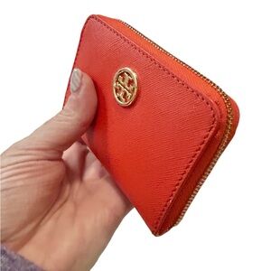 Brand new never used. This gorgeous authentic Tory Burch Robinson zip coin wallet is crafted from the our signature saffiano (cross-grain) leather in a vibrant orange (Soriano) shade, finished with the iconic Tory Burch gold-tone double-T logo.