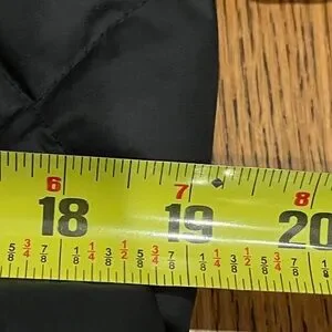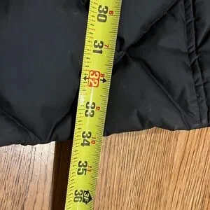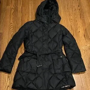 Elegant black puffer coat with hood. Features quilted design and adjustable belt. Quality, front pockets, zipper/snap front closure.Ideal for cold weather.Pre-used.