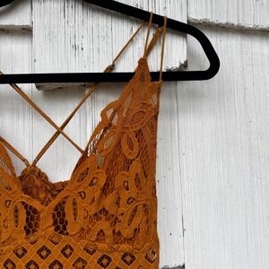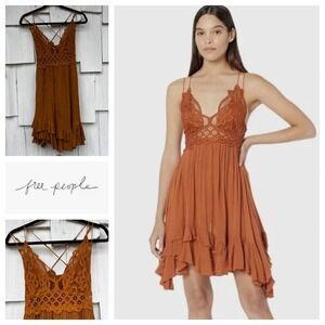 Free People mini dress in a rich terracotta orange hue. This charming piece features a delicate crochet lace bodice with intricate detailing and a flattering criss-cross back strap design. The skirt is adorned with multiple tiered ruffles creating a playful, flowing silhouette.