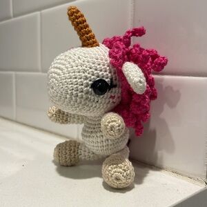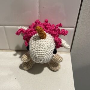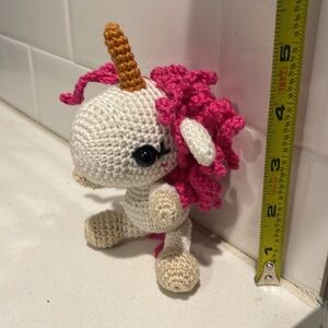 Handmade unicorn in amigurumi crochet style. Please see photos for sizing info and details. All photos are of unique item hand crafted by seller. Pattern from Theresa’s Crochet Shop.