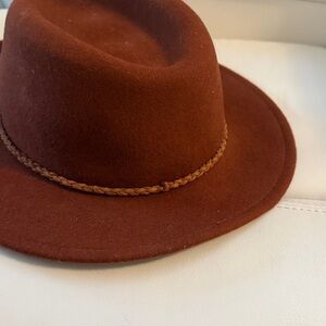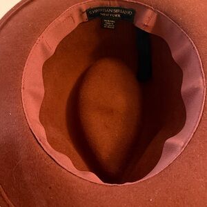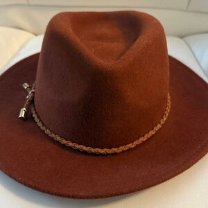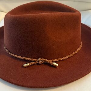 Christian Soriano 100% WoolnStylish brown fedora hat featuring a braided band with metallic accents. Perfect for adding a touch of elegance to any outfit.