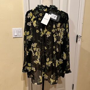 Chic black blouse with vibrant yellow and green floral pattern. Features ruffled neckline and long sleeves. Semi-sheer fabric. Tie at neck to leave loose or tie at the top. Neck ruffle, cuffs, and neck tie are a contrasting fabric. So cute!