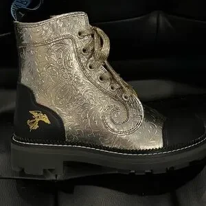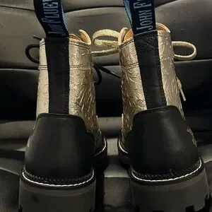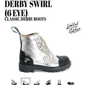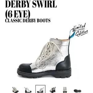 Crafted from specialty platinum gold embossed leathers, the Fluevog Day 2020 Derby Swirl boots commemorate John's 50th Anniversary in shoe-business! This specialty leather requires a bit more tender love and care than your average material, so please wear them with pride but also thoughtful caution!