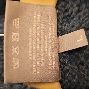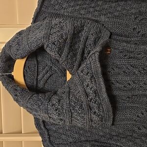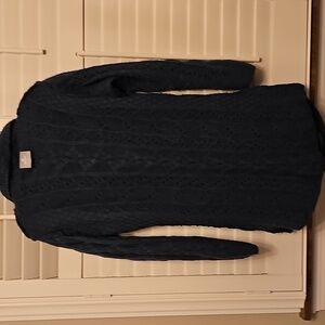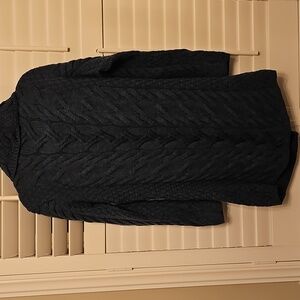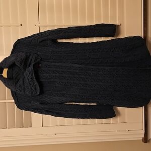 Stylish navy cable knit cardigan. Features three buttons on the outside and one smaller button on the inside for closure . Perfect for layering. Measurements are approximate. 17 inch shoulder, 20 inches underarm to underarm, sleeves from shoulder is 23 inches, front from shoulder side seam is 30 inches and 32 inches center point. Used, clean, very good condition.