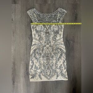This JOVANI beaded cocktail dress will have you looking and feeling gorgeous . The fit is tight yet still incredibly flattering, featuring a scoop neckline and cap sleeve for added elegance. The dress is accented with sparkling stones for a glamorous look. The skirt falls to a short length and the low back completes this eye-catching look, this dress will be your perfect companion for any event.