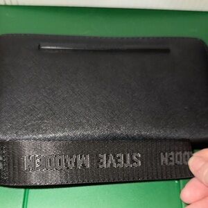 Sleek black clutch wallet. Features zip-around closure. Includes wristlet strap.
