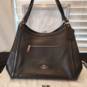 Chic black leather with pebbled texture. Features a front zip pocket. Stylish and functional for everyday use.