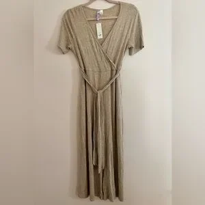 New with tags! Gorgeous ribbed knit jumpsuit from Francesca’s in a versatile heather oat color. This comfortable and flattering piece features a wrap-style surplice neckline, short sleeves, and a tie waist for a customizable fit. The wide-leg silhouette and ribbed texture give it a casual yet polished look.