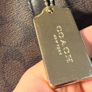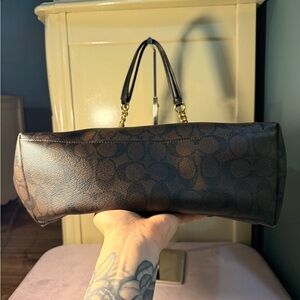 Stylish Coach tote in dark brown. Features signature pattern and gold chain accents.