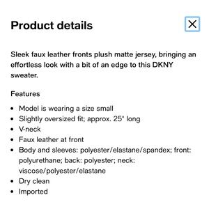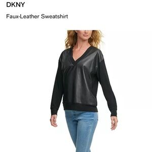 Understated style. Pullover top with a deep V neck. Front of top is faux leather, sleeves and back are a silky jersey fabric. Great for the office or errands.