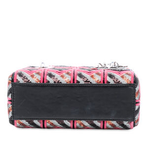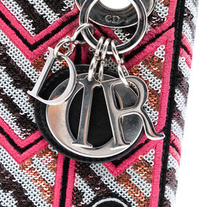 The Lady Dior features a patent leather body with sequin details, flat leather top handles, a detachable flat leather strap, a fold in flap closure, and an interior zip pocket. It carries a B+ condition rating.