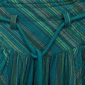 Free People harem pants in a teal multicolor woven stripe fabric. Relaxed drop-crotch silhouette with an adjustable rope drawstring waist and side pockets. Lightweight and breathable—perfect for festival season, travel, or everyday boho style.