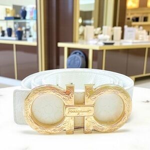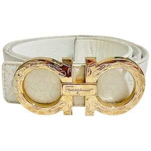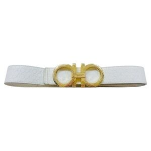 Salvatore Ferragamo Vintage White Gancini Engraved Leather Belt with Gold Buckle