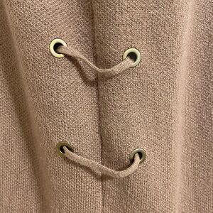 Beautiful milk chocolate sleek silhouette. Two large front patch pockets. Sides have gold tone grommets with laces. Such a great versatile item. Great with boots and jeans, dress pants for professional business. Nice medium weight.