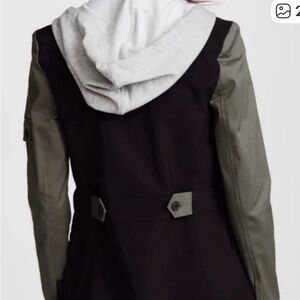 Veronica Beard Army Dickey Jacket. Gray zippered, hooded dickey lining. Wool exterior with flap pockets. Army green cotton sleeves with pockets. In excellent pre-owned condition, no flaws.