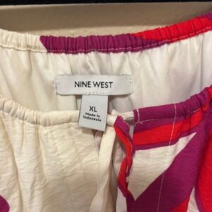 Chic asymmetrical dress by Nine West. Features bold red and purple patterns on a white base. Perfect for stylish outings.