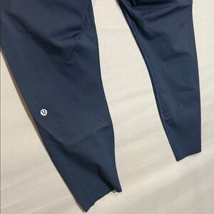 Lululemon high-rise athletic leggings in classic navy blue. Supportive stretch performance fabric with a sleek, flattering fit—ideal for yoga, workouts, walking, travel, and everyday athleisure wear.