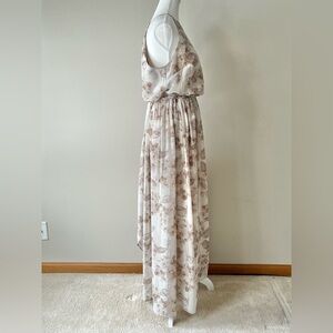 * Measures approximately 67 inches from shoulder strap to hem, offering graceful floor-length coverage and a flattering blouson silhouette.is elegant floral maxi dress features a beautiful cream and brown pattern, perfect for any occasion. Its flowing design offers both comfort and style.