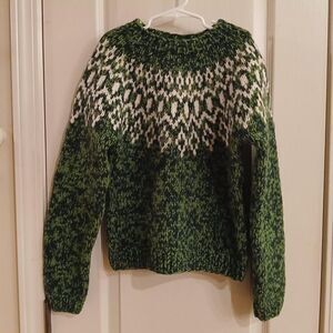 Vintage American Eagle Outfitters green and white hand-knit Fair Isle 100% lambswool sweater in size small.