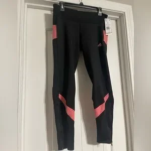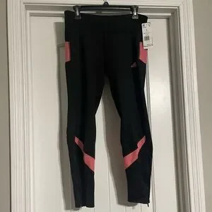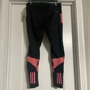 The adidas Own the Run TGT in Black / Hazy Rose are women's running tights designed for comfort and support during everyday runs. They feature moisture-wicking AEROREADY technology, convenient pockets, and reflective details for visibility.