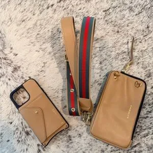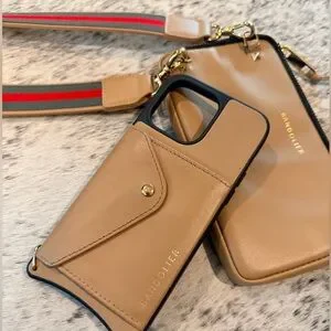 Bandolier Donna Pouch Set - iPhone 14 Pro Max. Genuine leather luxury set. Features includes: light weight & drop proof case with slim card pocket 3x4, removable crossbody strap, spacious pouch 4x7x1 that clips on strap. Light pen mark. See photos.