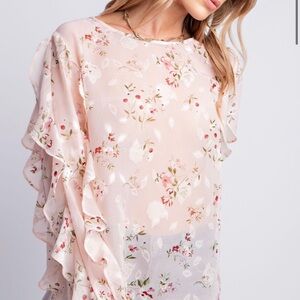 Elegant blouse with floral design. Features ruffle sleeves. Ideal for a graceful look.