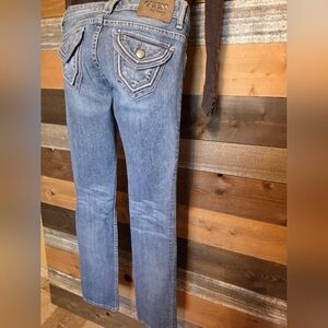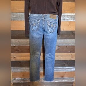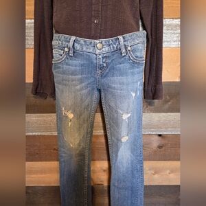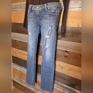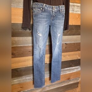 Stylish blue jeans with a straight leg design. Features subtle distressing for a trendy look, size 26, in EUC! Please see all photos for condition and best description!