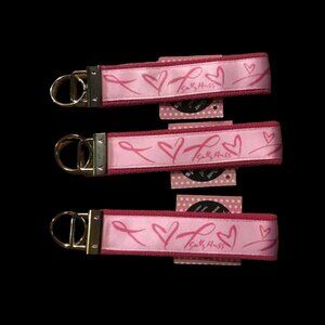 Sally Huss Keychain, 3x, in “A Cure For Sure” design and pink color. Features a trendy grosgrain ribbon backed with cotton webbing. These key fobs are perfect for anyone, made from medium to heavy-duty cotton webbing with a stylish printed ribbon. Brand new with tags attached. The item pictured is exactly what you’ll receive.
