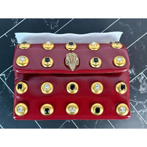 Brand: Kurt Geiger LondonStyle: Medium Kensington Shoulder BagCondition: New with Tags (NWT / BNWT)Color: Red (Patent Leather)Hardware: Gold-tone metal chain and embellishmentsModel/Style Number: 2721066109Features & DesignMaterial: High-shine patent leather exterior, polyester interior lining.Embellishments: Features large gold-tone studs set with contrasting black and clear crystals.Signature Detail: Iconic crystal-encrusted eagle head emblem on the front flap.Strap: Versatile gold chain strap that can be worn long as a crossbody or doubled as a shoulder bag.Closure: Magnetic snap closure.Interior: One main compartment with an internal slip pocket.Approximate Dimensions:Width: 8.66" (22 cm)Height: 6.88" (17.5 cm)Depth: 6.1" (15.5 cm)Strap Drop: 22.44" (57 cm)
