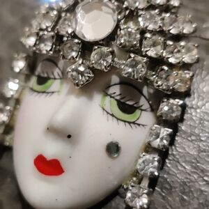 gorgeous rare one of a kind 2 in vintage arts deco flapper woman with prong sets rhinestones signed by artist on the back.