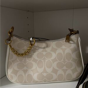 Chic Coach shoulder bag in cream with gold chain accents. Ideal for stylish outings.