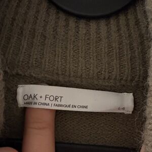 Cozy kahki asymmetric button-up sweater with a high collar.
