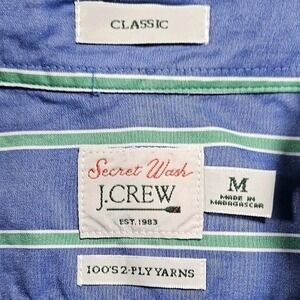 Elevate your everyday style with this J. Crew Secret Wash button-down shirt. Experience the comfort of 100s 2-ply yarns in a classic fit designed for effortless wear. The crisp blue and green stripe pattern adds a touch of preppy charm, perfect for a casual day out or a relaxed office environment. Its breathable fabric and timeless design make it an ideal choice for weekend brunch or a casual dinner.