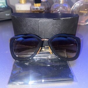 Stylish Prada sunglasses with a bold black frame and elegant gold accents. Perfect for adding a touch of luxury to any outfit.