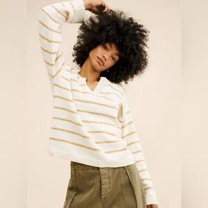 Sanctuary Chill Vibes sweater featuring a soft 100% cotton knit in a cream base with tan horizontal stripes. Designed with a relaxed, slightly boxy fit and a split V-neckline, this sweater has an easy, laid-back look that works well for everyday wear.