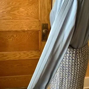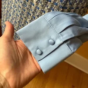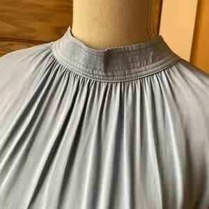 A chic and silky blouse with a gathered, high neck. Two-button back closure with keyhole opening. Double-button cuffs with a strip of over-stitched fabric that offers drama and structure to the sleeves. Modern and sophisticated design in an elegant shade of blue.