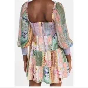 Vibrant patchwork design. Square neckline. Long puff sleeves. Flowy skirt.