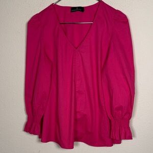 In excellent condition! Chic pink pblouse with V-neckline. Features stylish puff sleeves and gathered cuffs.