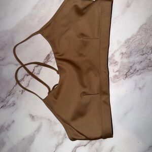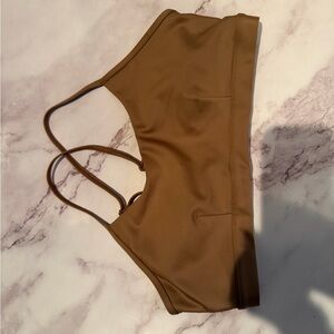 Stylish tan sports bra with thin straps. Perfect for workouts.