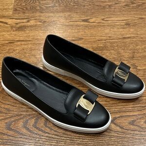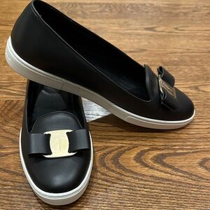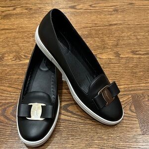 Stylish black flats by Salvatore Ferragamo. Features a distinctive gold buckle. Ideal for a refined look.